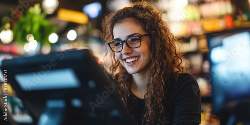 A young woman with curly hair and glasses sits at a desk in a bright indoor setting, smiling as she looks at a computer screen, representing joy and engagement.