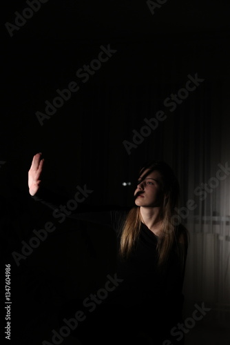 A young woman with long blonde hair sits in the dark illuminated by soft side lighting. Her gaze is thoughtful and the background is dark and blurred creating an atmosphere of melancholy and solitude.
