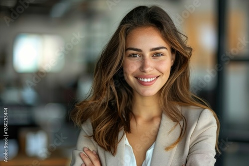 A young woman with long brown hair smiles confidently, arms crossed, in a beige blazer.