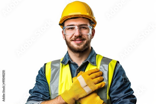 A young worker smiles confidently while wearing yellow safety gear, including a hard hat, high-visibility vest, and protective gloves, symbolizing safety and readiness in the construction field.