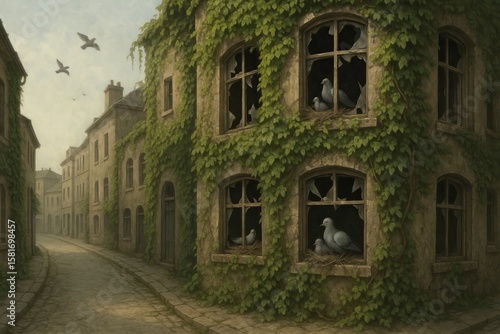 Abandoned Building Surrounded by Ivy and Doves in Enchanted Village
