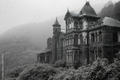 Abandoned Gothic Mansion Surrounded by Fog and Nature’s Lush Greenery in Monochrome