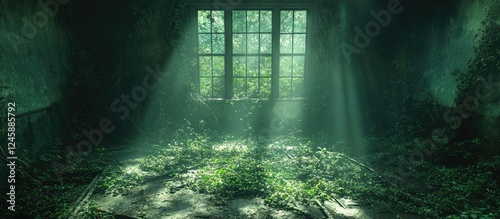 Abandoned house interior with sunlight filtering through window illuminating overgrown vegetation and branches in a lush green setting