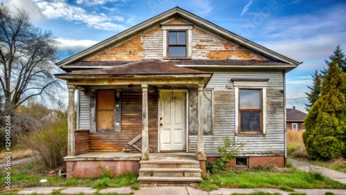 Abandoned house with boarded-up windows and a broken front door, neglected yard