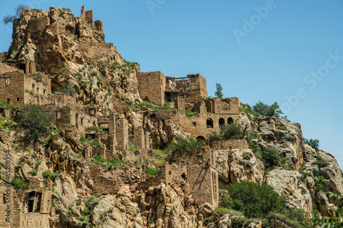 Abandoned houses of the ancient village of Gamsutl with destroyed stone walls of the building on the top of a mountain peak against the background of mountains in summer in Dagestan, Russia