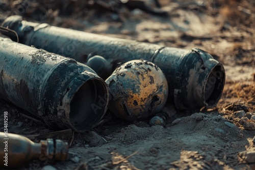 Abandoned mortar gun and shell remnants in a forgotten landscape, A close-up view of an abandoned mortar gun and unused mortar bombs