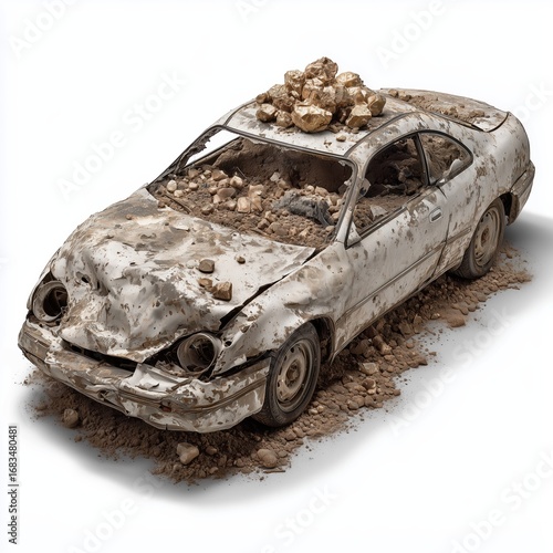 Abandoned mud-covered car with rocks on roof in dilapidated condition