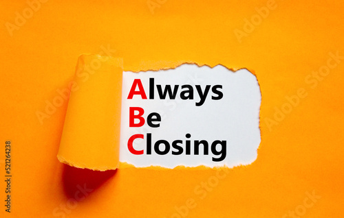 ABC always be closing symbol. Concept words ABC always be closing on white paper on a beautiful orange background. Business and ABC always be closing concept. Copy space.