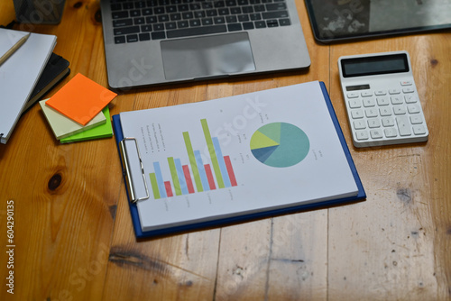 Above view of financial chart, laptop computer, calculator and digital tablet on wooden office desk