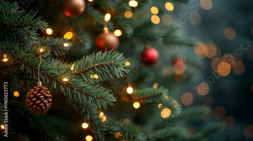 Above view on pine tree branches with Christmas fairy lights and cones