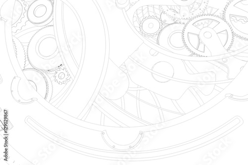 Abstaract 3d rendering illustration of watches with gears. Sketch looking outline lines.