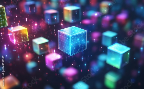 Abstract 3D Composition of Colorful Cubes with Digital Patterns Surrounded by Glowing Particles in a Night Sky Background