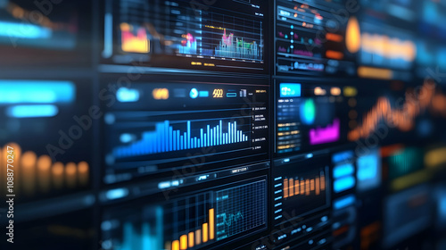 Abstract 3D Digital Dashboard Displays Dynamic Financial Data and Market Trends with Glowing Visualizations