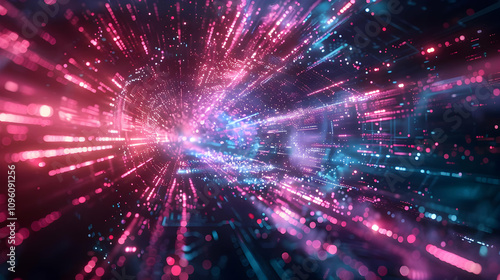 Abstract 3D Digital Tunnel Background with Pink and Blue Glowing Particles, Creating a Futuristic and Dynamic Visual Effect