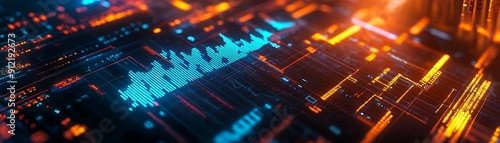 Abstract 3D Futuristic Technology Background with Blue and Orange Glowing Lines and Digital Data