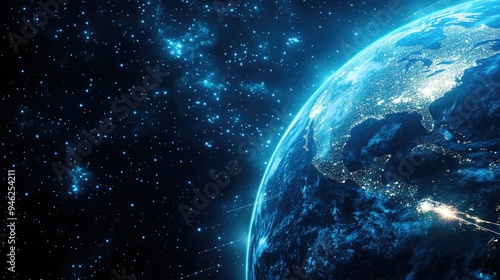 Abstract 3D globe with satellite beams, no people, space for text