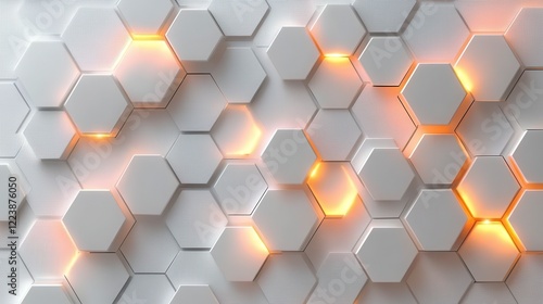 Abstract 3D Hexagon Pattern with Glowing Orange Lights Modern Geometric White Background Texture