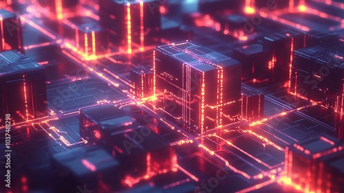 Abstract 3D illustration of glowing red lines over a dark, reflective surface.