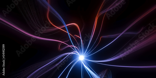 Abstract 3D illustration of purple glowing orb with long curly waving tendrils, science or research concept, neuron cell or synapse visualization on black background