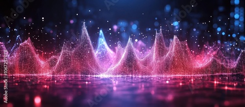 Abstract 3D landscape with glowing particles and a reflective surface.