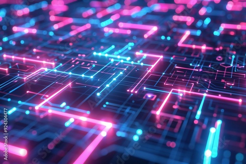 Abstract 3D render of neon geometric shapes with glowing lines and circuits , created ai