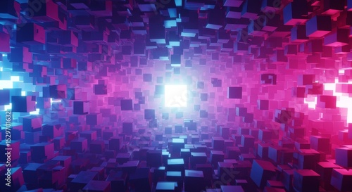 Abstract 3D Rendering Cubes Glowing Bright Blue Purple Geometric Tunnel