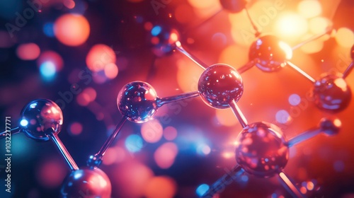 Abstract 3D rendering of a molecular structure with glowing orbs and a blurred background.