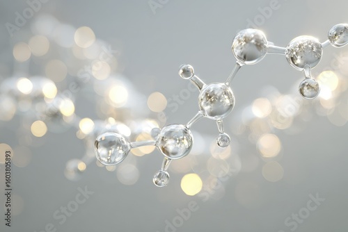 Abstract 3D rendering of a molecule, glistening spheres connected by bonds, set against a blurred, luminous background