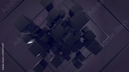 Abstract 3d rendering of chaotic particles. Colored cubes in empty space. Black background
