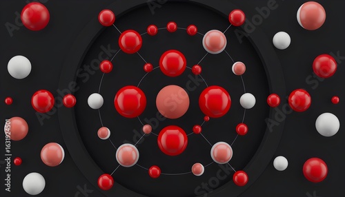 Abstract 3D rendering of interconnected red and white spheres, forming a complex network pattern against a dark background.