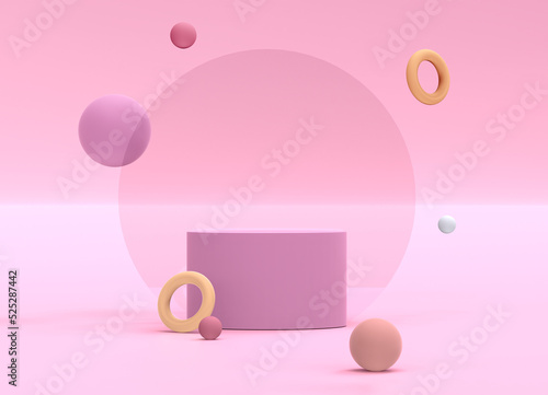 Abstract 3d rendering of podium for cosmetics, perfume, products presentation. Ready made scene. Geometric figures flying next to pink matte pedestal. Futuristic stand mockup