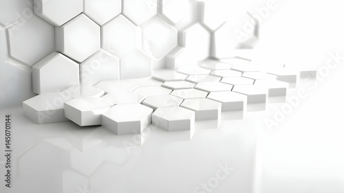 Abstract 3D rendering of white hexagonal shapes cascading from a wall onto a reflective surface