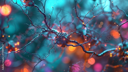 Abstract 3D representation of a neural network with neon synapses and glowing ultraviolet nodes on a colorful background.
