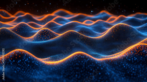 Abstract 3D space with interconnected polygons and floating dots forming wave patterns, symbolizing order emerging from chaos, the infinite web of connections, and modern technological networks