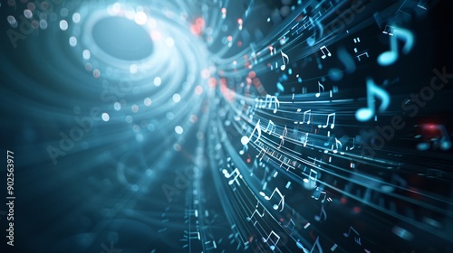 Abstract 3D spiral of glowing music notes, 3D background music, dynamic and captivating.