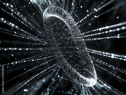 Abstract 3D torus with radiating lines of particles creates a dynamic visual effect in a dark environment.