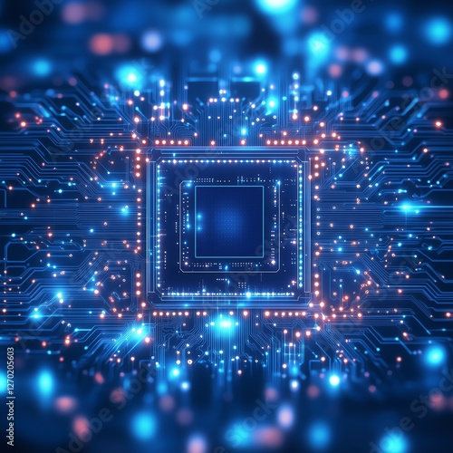 Abstract AI chip with glowing circuit lines on a clean blue tech background, offering ample copy space for futuristic digital concepts.