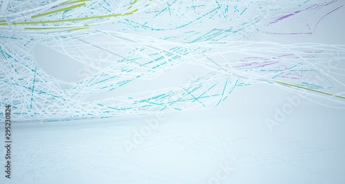 Abstract architectural white and glass gradient color smooth wire interior of a minimalist house with large windows.. 3D illustration and rendering.