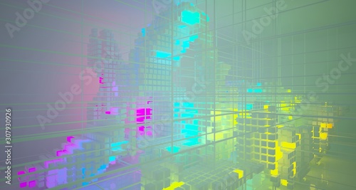 Abstract architectural white interior from array cubes with color gradient neon lighting. 3D illustration and rendering.