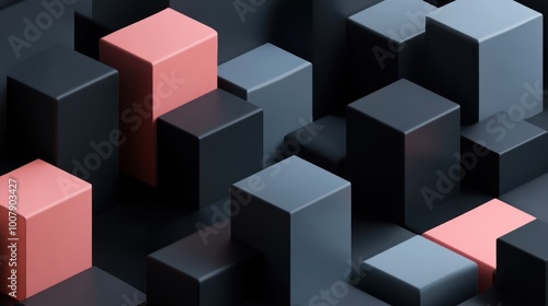 Abstract arrangement of geometric blocks in varying shades of gray and pink.
