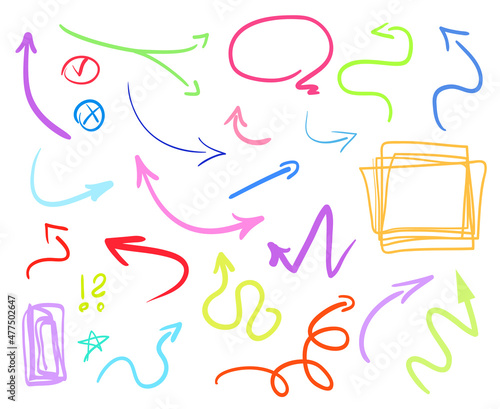 Abstract arrows. Multicolored infographic elements on white. Set of different indicator signs. Hand drawn simple objects. Line art. Symbols for work