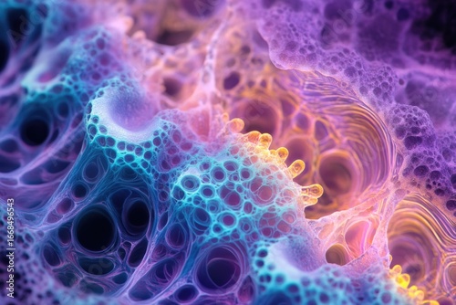 Abstract art depicting a vibrant, porous, bioluminescent organic structure with intricate details and a surreal, dreamlike quality.