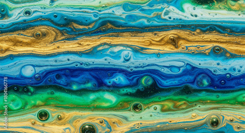 Abstract art Fluid swirls of gold blue and green paint with bubblelike textures forming horizontal bands