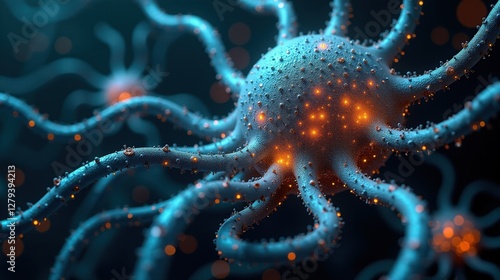 Abstract Art in a hyper-realistic network of biomimetic AI, metallic tendrils resembling organic synapses, data pulses moving like electrical impulses, evolving fractal geometry