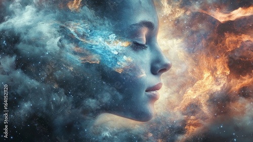 Abstract art of a woman's face surrounded by blue and orange nebulae.