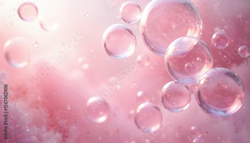 Abstract art of pink bubbles floating in air. Background with shimmering light, depth, water drops, surface tension. Transparent, dreamy, iridescent bubbles against blurred cloud. Modern, elegant,