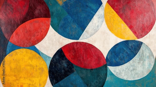 Abstract art painting with red, blue, yellow, and white circles and semi-circles on a white background.