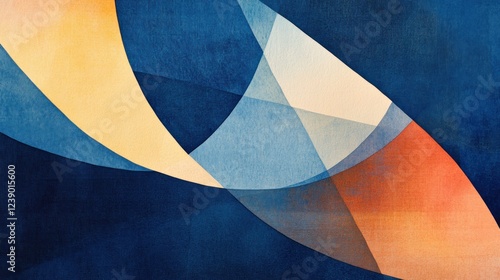 Abstract art with overlapping translucent shapes in blue, orange, and yellow hues on a textured background.