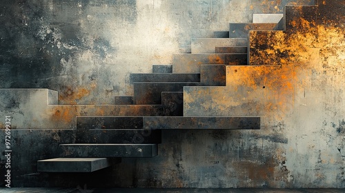 Abstract artwork featuring a staircase leading upward into a bright yellow background, contrasted by dark, textured black and gray tones, evoking a sense of ascent and transformation.