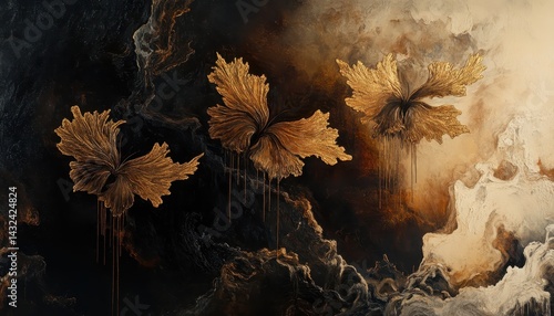 Abstract artwork of stylized butterflies, dark and light hues, flowing forms